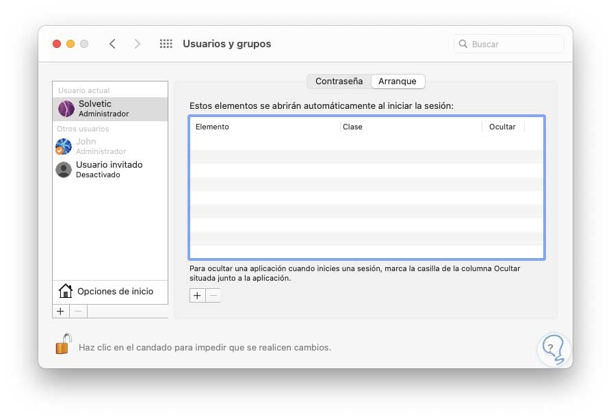 Damos clic en “Usuarios y grupos” y después de ello damos clic sobre el icono de candado para habilitar la edición, allí vamos al usuario actual y nos dirigimos a la pestaña “Arranque”, veremos lo siguiente: