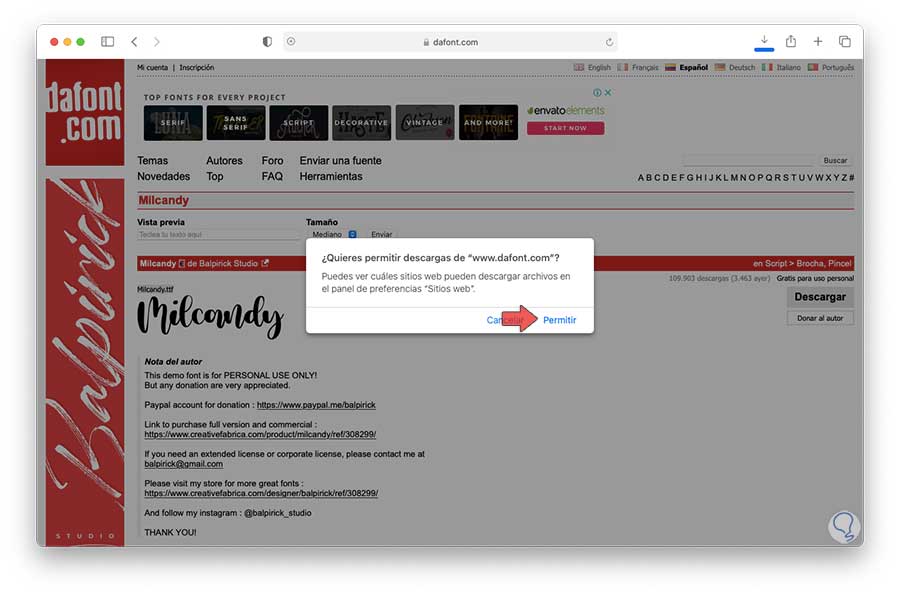 En este caso hemos seleccionado la fuente “Milcandy”, damos clic en el botón Descargar y en este caso macOS Big Sur solicitara permiso para realizar la descarga. Damos clic en “Permitir” para proceder con la descarga de esta fuente.