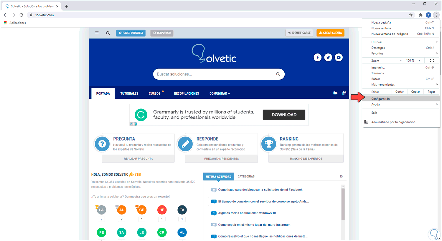 Para el caso de Google Chrome en PC debemos abrir una nueva ventana y pulsar en el menú “Personaliza y controla Google Chrome”, en el listado desplegado seleccionamos “Configuración”: