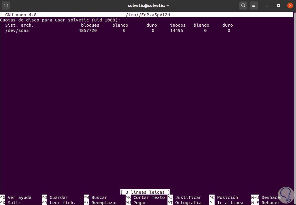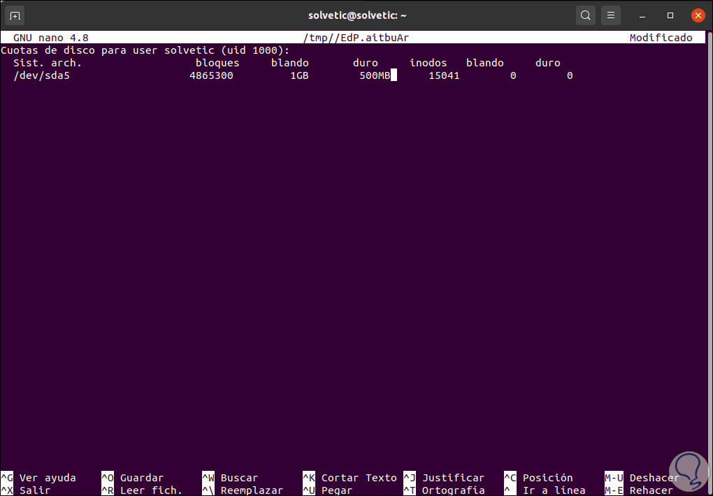 sudo edquota -u solveticEL parámetro -u indica que la cuota pertenece a un usuario, al pulsar Enter veremos lo siguiente: