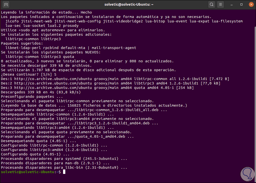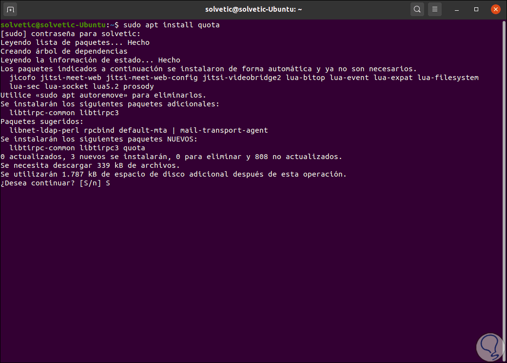 Ingresamos la letra S para confirmar la descarga e instalación de quota en Ubuntu 20, cuando este proceso finalice veremos lo siguiente:
