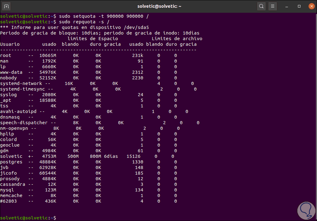 sudo setquota -t 900000 900000 /Nuevamente ejecutamos sudo repquota -s / para comprobar: