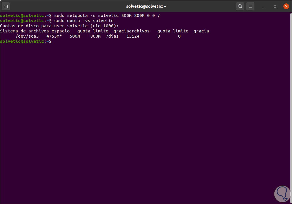 sudo setquota -u “usuario” tamañoM 0 0 /Validamos los cambios con el comando sudo quota -vs “usuario”