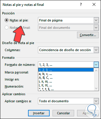 Podemos repetir este proceso para todas las notas deseadas, la ventana de este administrador es que podemos definir donde se ubica la nota, así como el formato de la numeración: