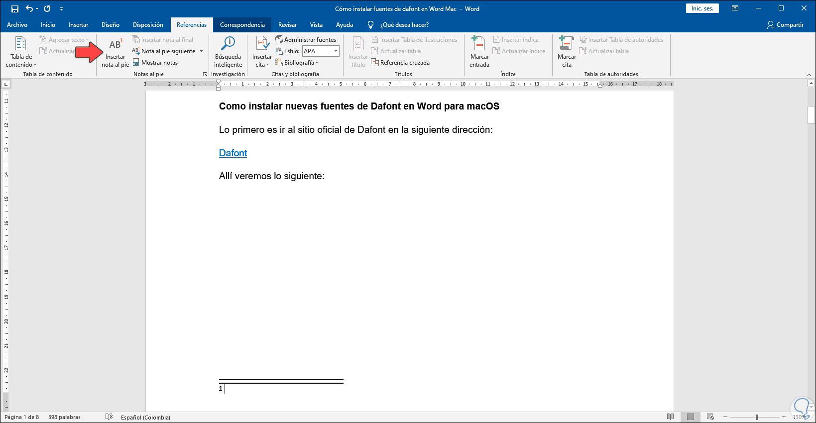 Podemos seleccionar parte del texto o una sola palabra, en la ventana emergente seleccionamos “Notas al pie” y al dar clic en Insertar vemos que se añade la opción para agregar la respectiva nota: