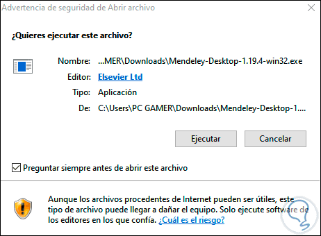 Una vez descargado damos clic sobre el ejecutable y será lanzado el asistente de instalación y recibiremos la siguiente advertencia: