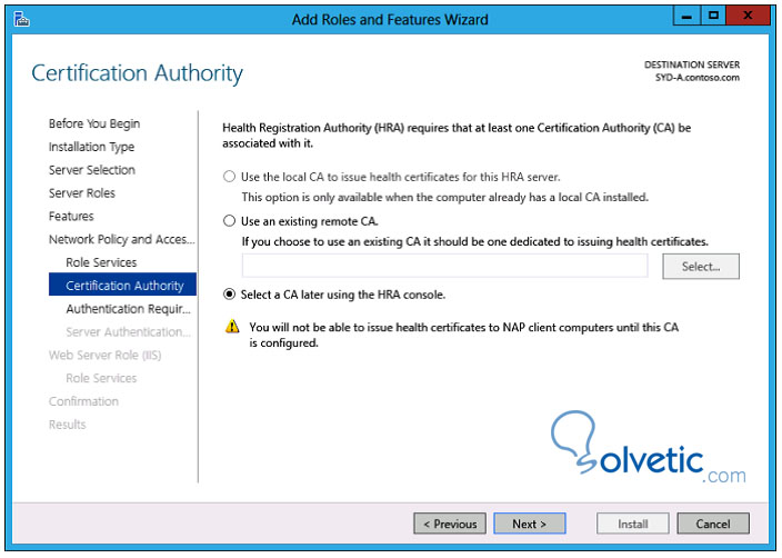 Si elegimos el HRA nos pedirá un Certification Authority podemos elegir uno en el momento o dejarlo para luego del deploy.