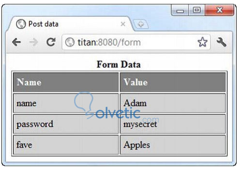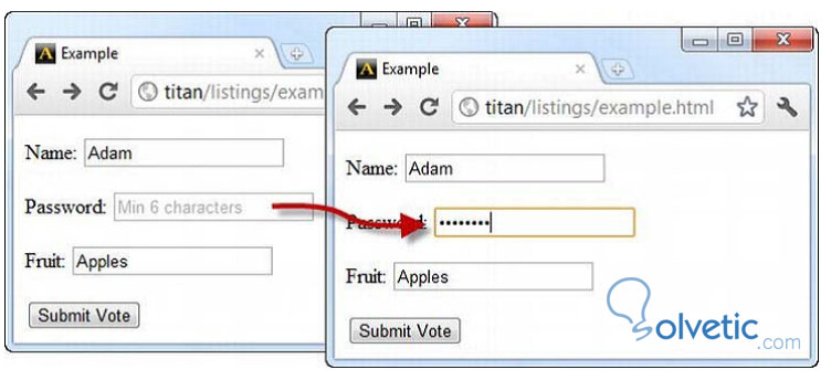 <!DOCTYPE HTML> <html> <head> <title>Example</title> </head> <body> <form method="post" action="http://titan:8080/form"> <p> <label for="name"> Name: <input value="Adam" id="name" name="name"/> </label> </p> <p> <label for="password"> Password: <input type="password" placeholder="Min 6 characters" id="password" name="password"/> </label> </p> <p> <label for="fave"> Fruit: <input value="Apples" id="fave" name="fave"/> </label> </p> <button type="submit">Submit Vote</button> </form> </body> </html>