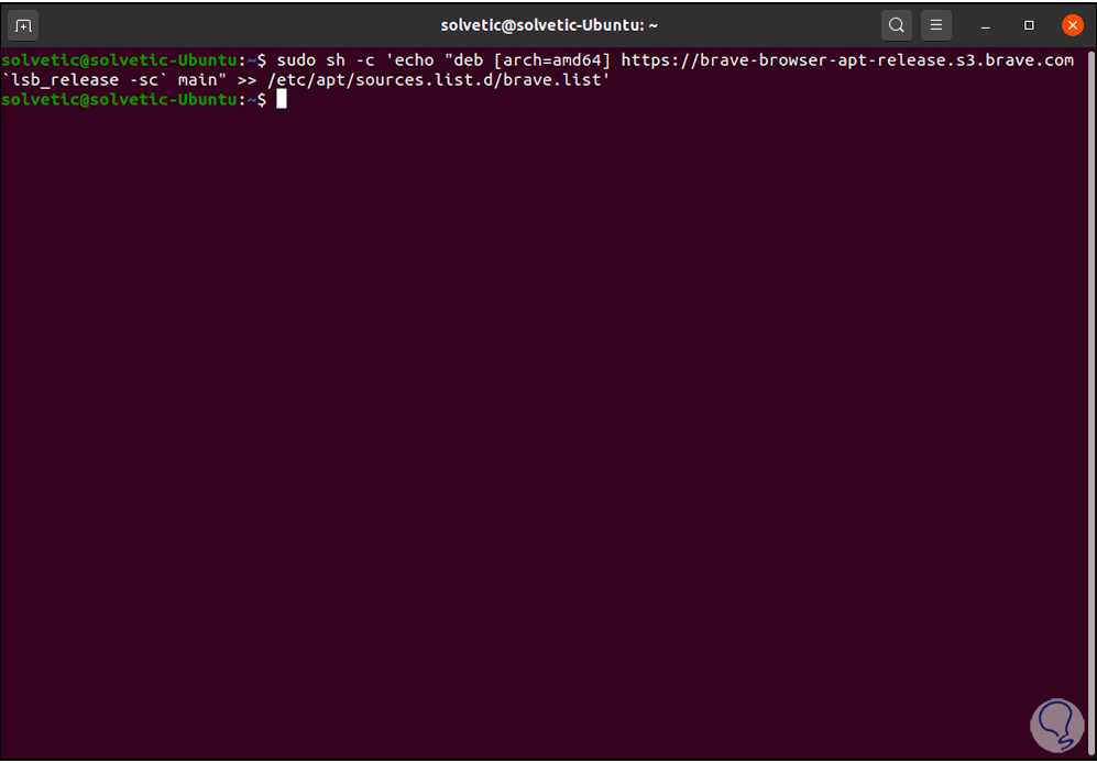 sudo sh -c 'echo "deb [arch=amd64] https://brave-browser-apt-release.s3.brave.com `lsb_release -sc` main" >> /etc/apt/sources.list.d/brave.list'