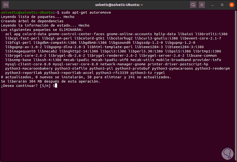 Ingresamos la letra S para confirmar la tarea de desinstalación de MySQL en Ubuntu 20.04: