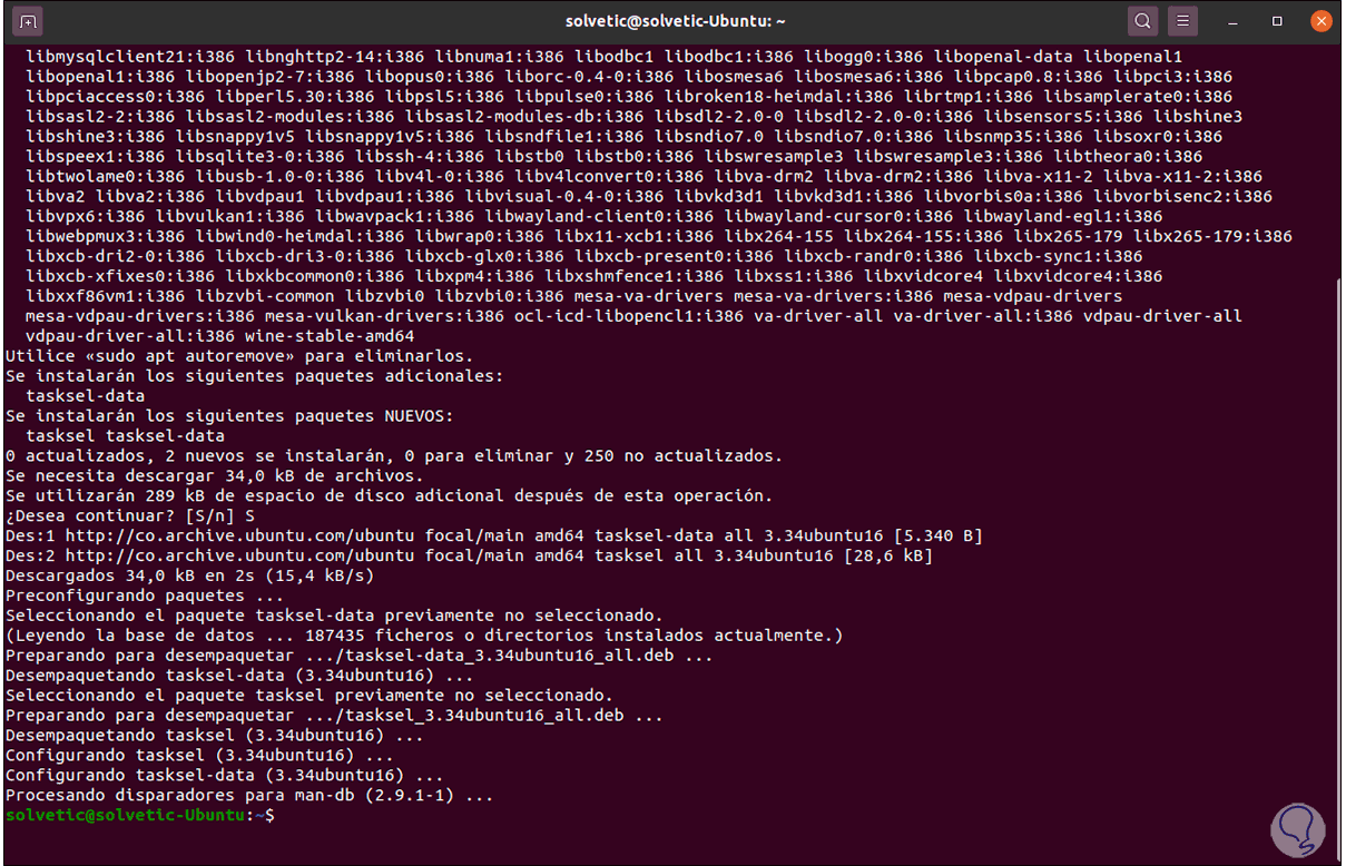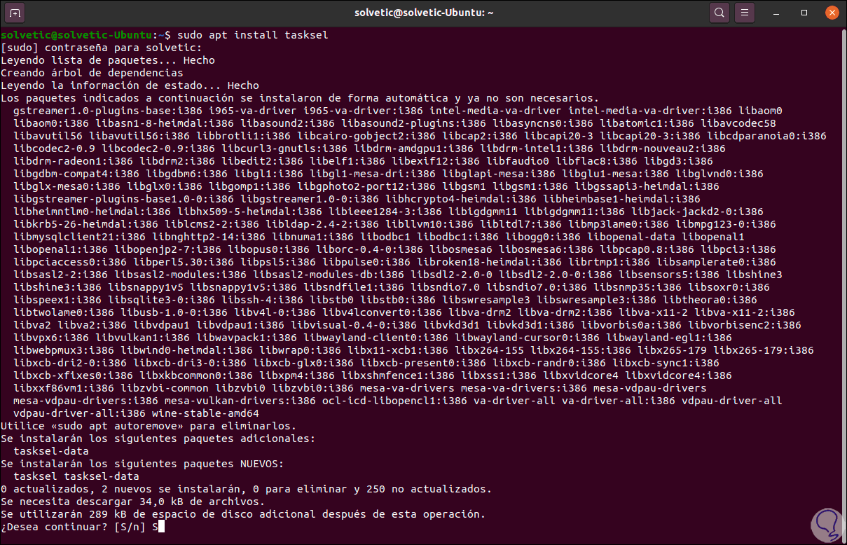 Ingresamos la letra S para confirmar la descarga e instalación de los paquetes de KDE: