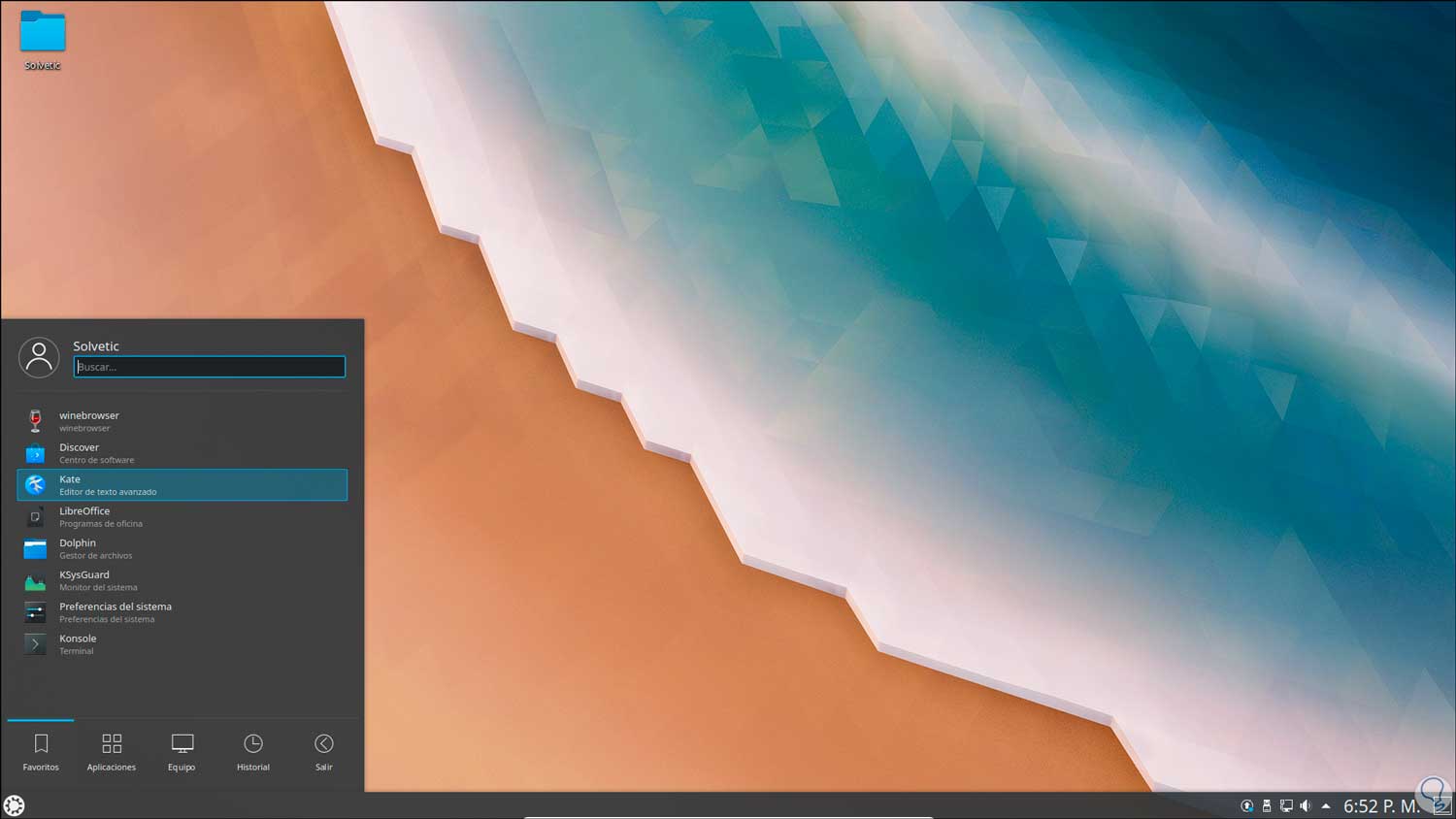 Podemos dar clic en el botón de Inicio para visualizar el diseño KDE Plasma: