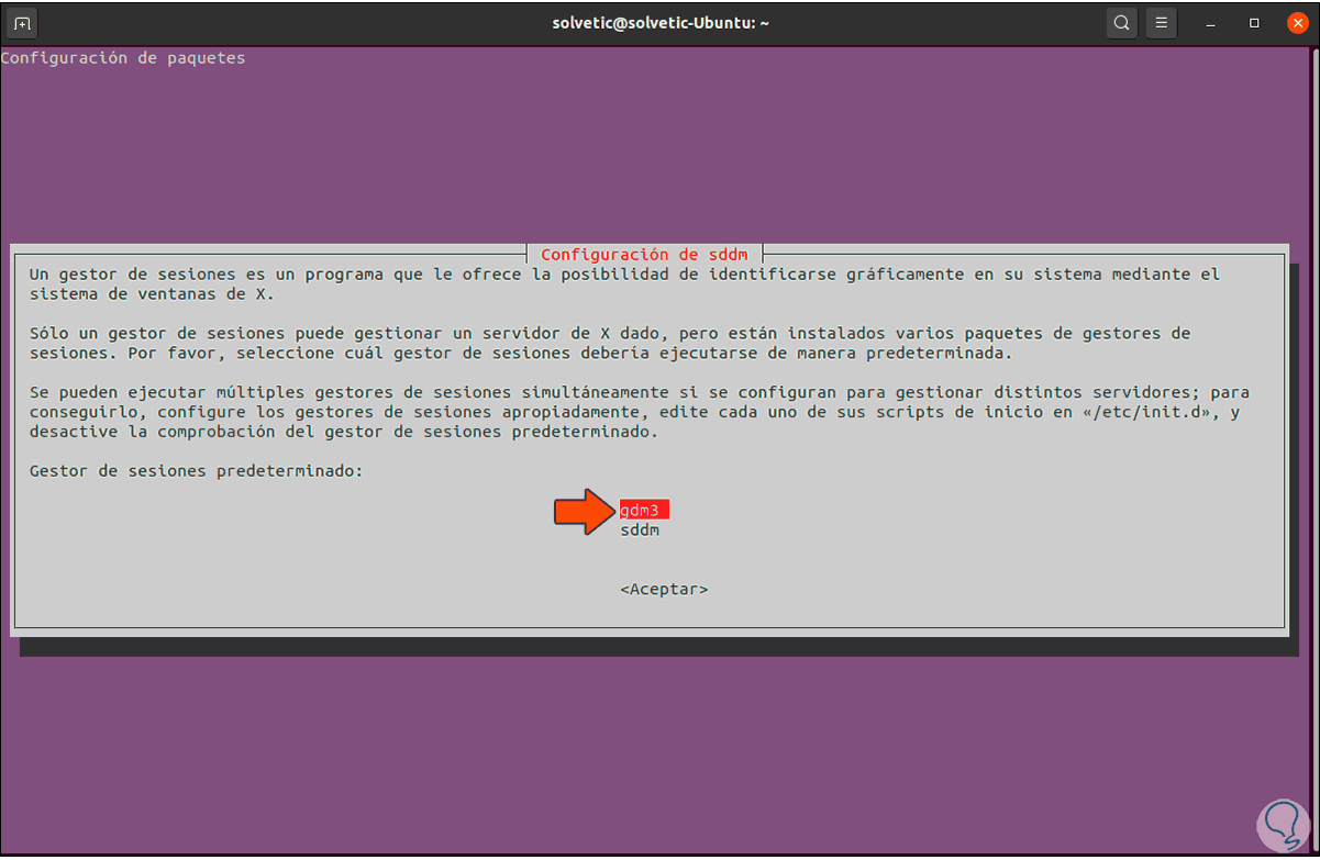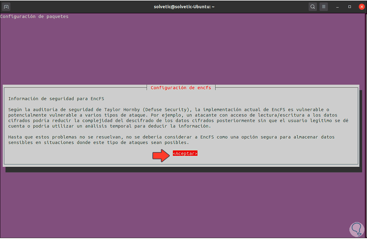 Allí se despliegan la información de seguridad de EncFS, damos clic en Aceptar, luego seleccionamos el administrador de pantalla y de sesiones (dejamos el valor por defecto):