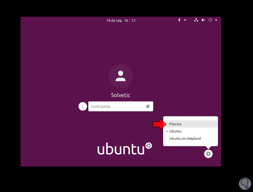 En la pantalla de inicio de sesión seleccionamos “Plasma” en el gestor de escritorios ubicado en el costado inferior derecho: