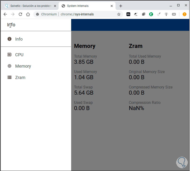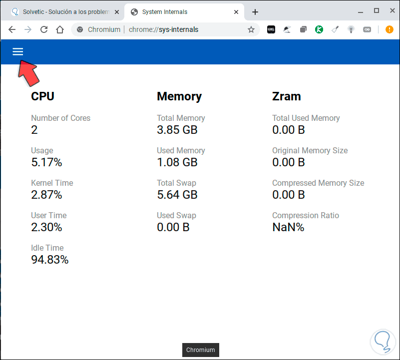 Saber siempre el estado de los componentes de nuestro equipo es algo clave para determinar la capacidad de trabajo que podemos aplicar sobre este. Un PC limitado de CPU, memoria o algún otro componente puede dejar de responder en momentos clave de trabajo, reiniciarse, congelarse o simplemente no responder de la forma esperada. Para determinar el estado de algunos de estos componentes, si usas Chromebook, dispones de una función integrada en el navegador con la que obtendrás una visión global de las estadísticas de estado y por ello en Solvetic veremos cómo hacer esto.