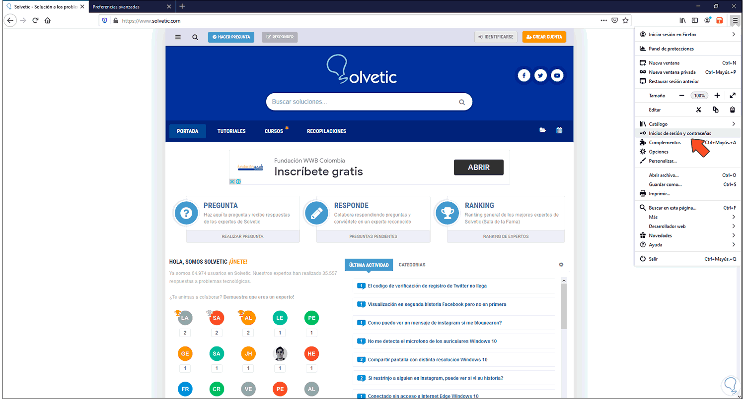 Una vez habilitada esta función en Firefox, vamos a la pestaña y damos clic en el icono de menú, en el listado desplegado seleccionamos “Inicios de sesión y contraseñas”:
