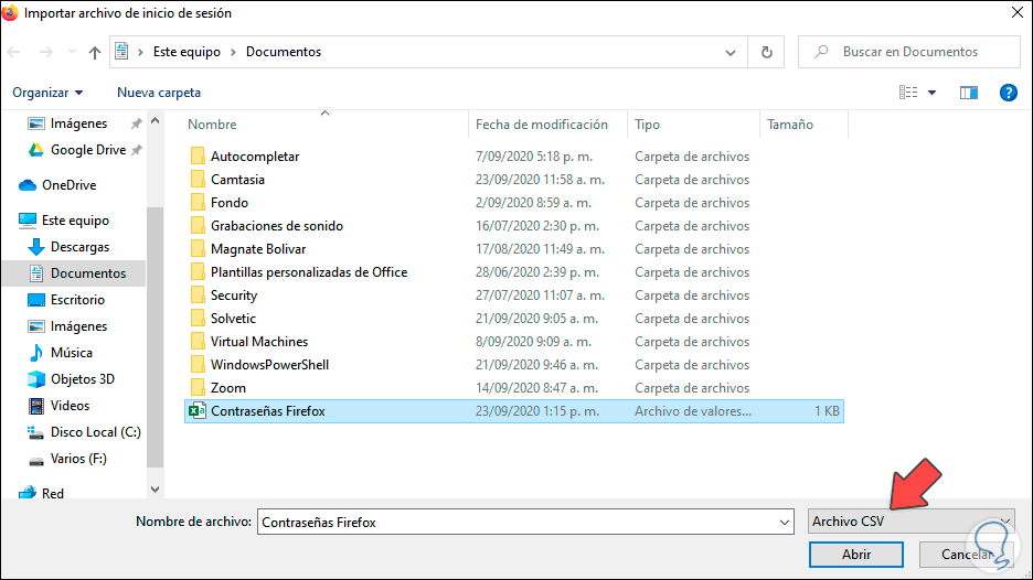 En la ventana emergente seleccionamos el archivo CSV desde donde se importarán las contraseñas. Damos clic en Abrir para completar el proceso.