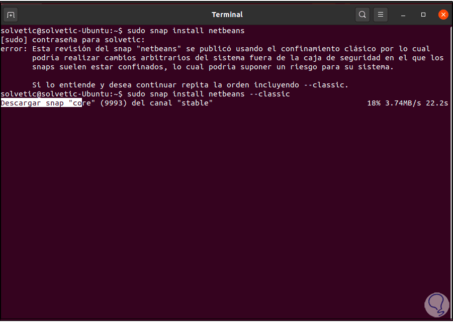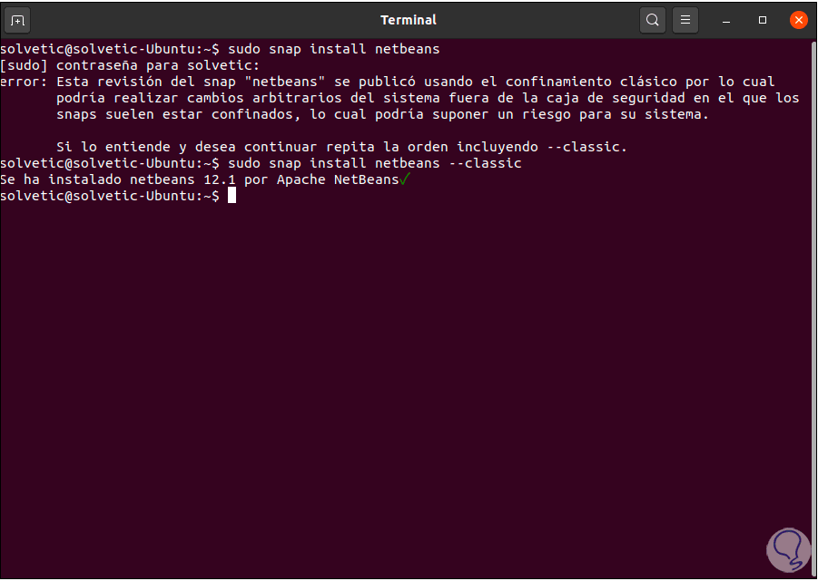 Podemos ver que al ejecutarse se genera un error debido a la forma como se empaqueto el snap de NetBeans, en este caso para usarlo de forma correcta añadimos la línea “—classic”: