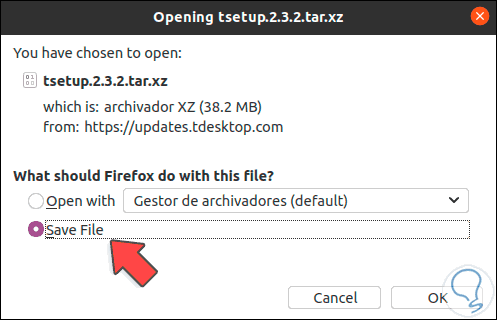 Damos clic en el botón “Get Telegram for Linux 64 bit”, debemos guardar el archivo localmente: