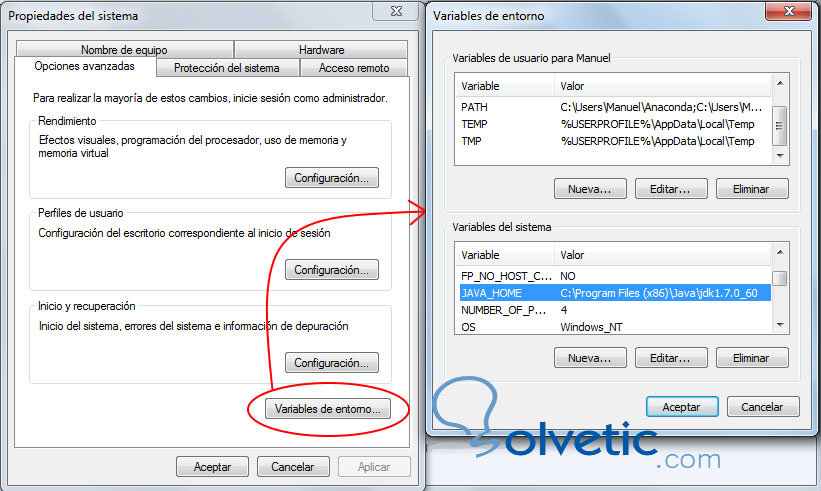 Donde deberás crear la variable “JAVA_HOME” (si no existe ya) y darle el valor correspondiente a la carpeta donde tienes instalado Java, en mi caso “C:\Program Files(x86)\Java\jdk 1.7.0_60.