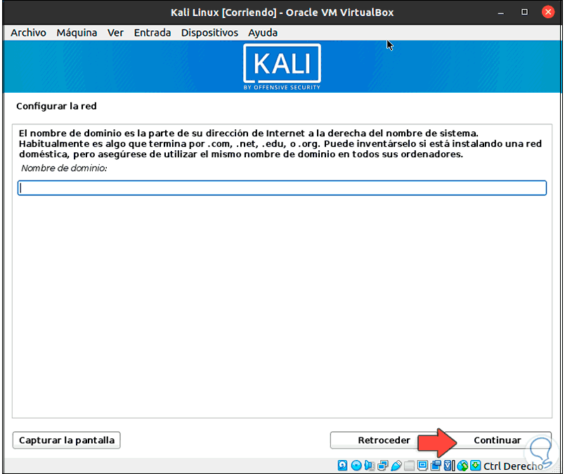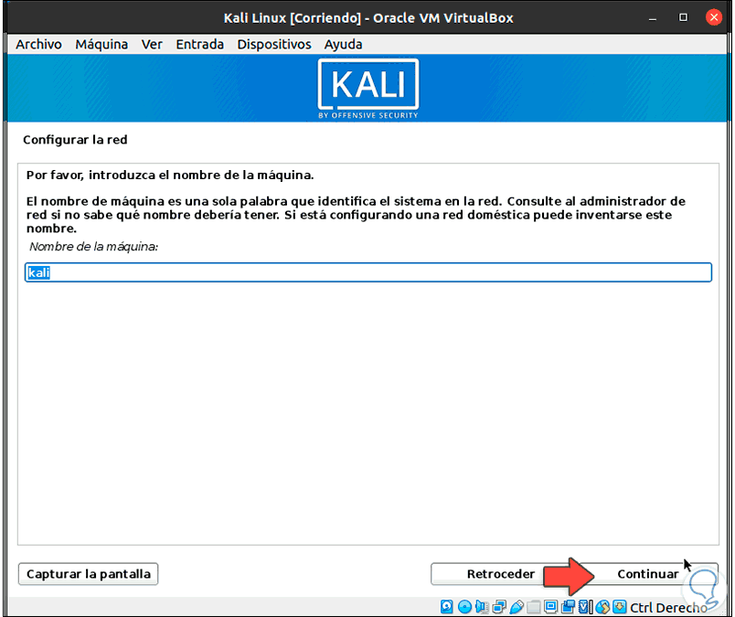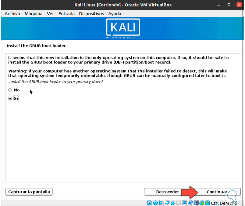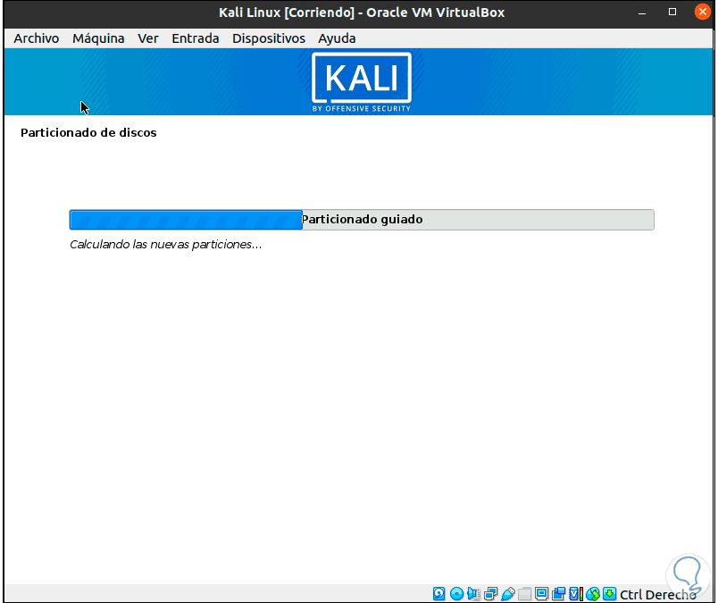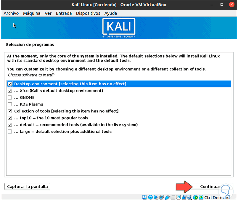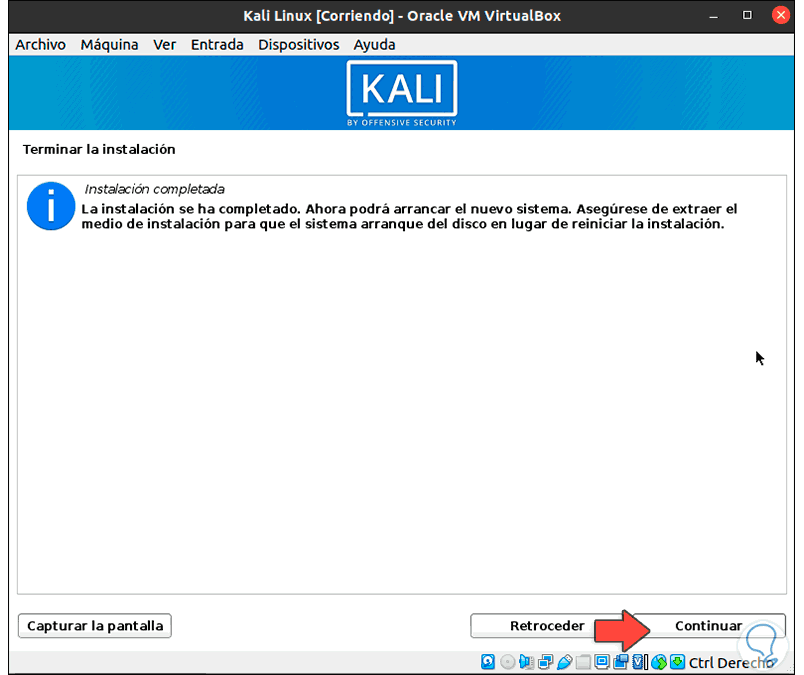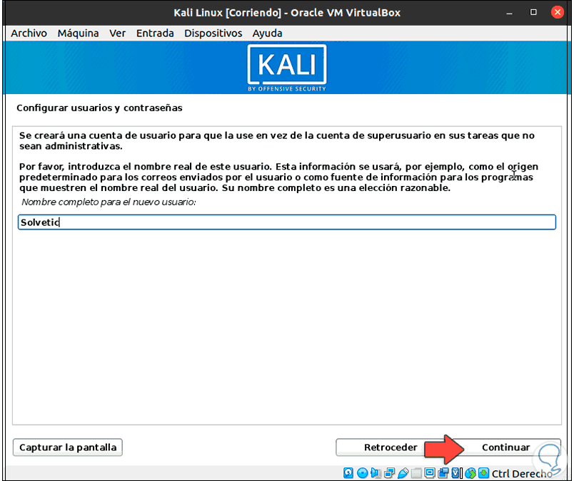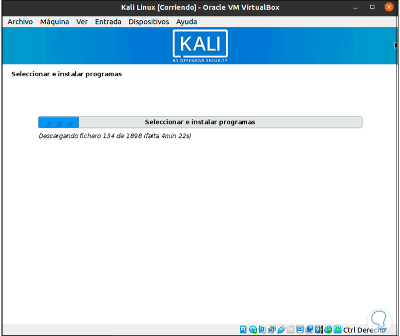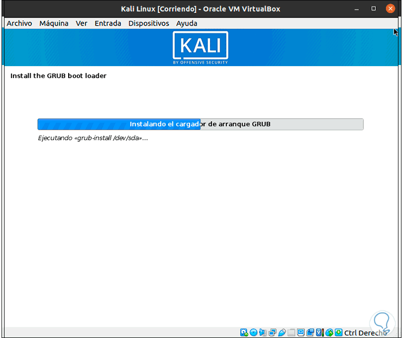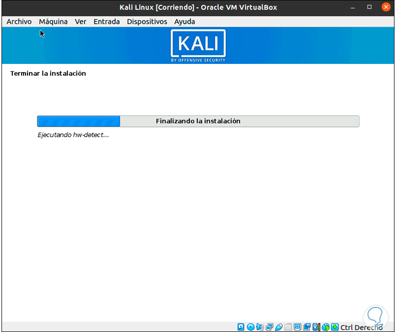 Después de esto entramos en la recta final de la instalación de Kali Linux en VirtualBox de Ubuntu: