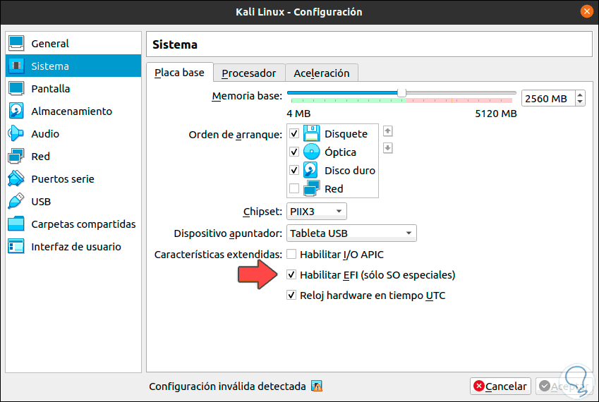Solvetic te dará la solución, para ello apagamos la máquina virtual y vamos a Configuración, en la sección Sistema activamos la casilla “Habilitar EFI (Solo SO Especiales)”: