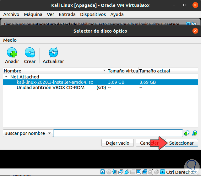 Damos clic en “Añadir” e iremos a la ruta donde se ha descargado la imagen ISO de Kali Linux: