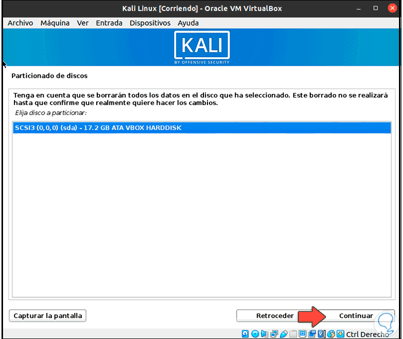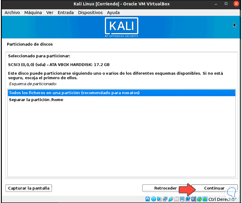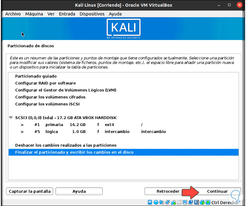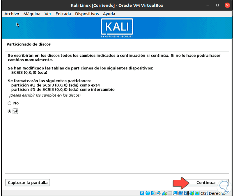 Damos clic en Continuar y se instalara el sistema Kali en el disco: