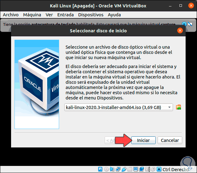 Damos clic en “Iniciar” para arrancar la máquina virtual y veremos la siguiente ventana: