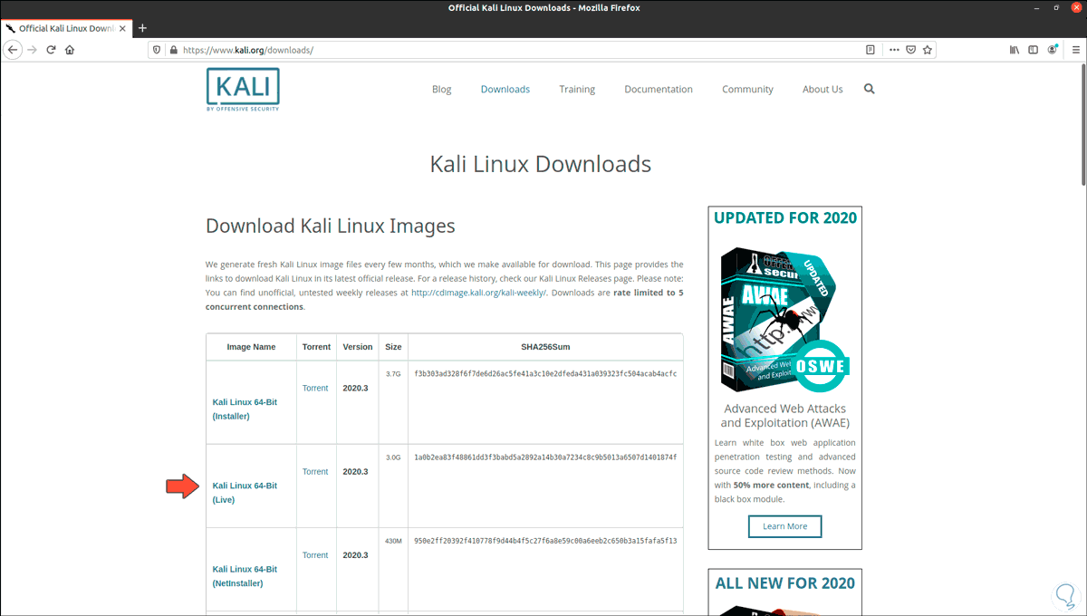 Iremos al sitio web de Kali Linux en el siguiente enlace: