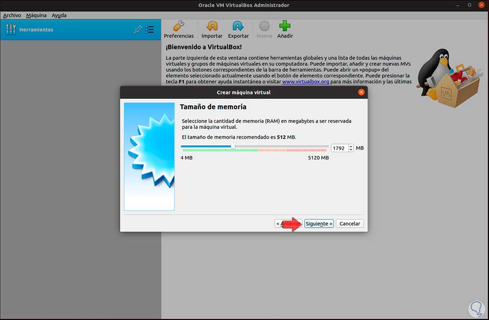 Damos clic en Siguiente y definimos la cantidad de memoria RAM a usar: