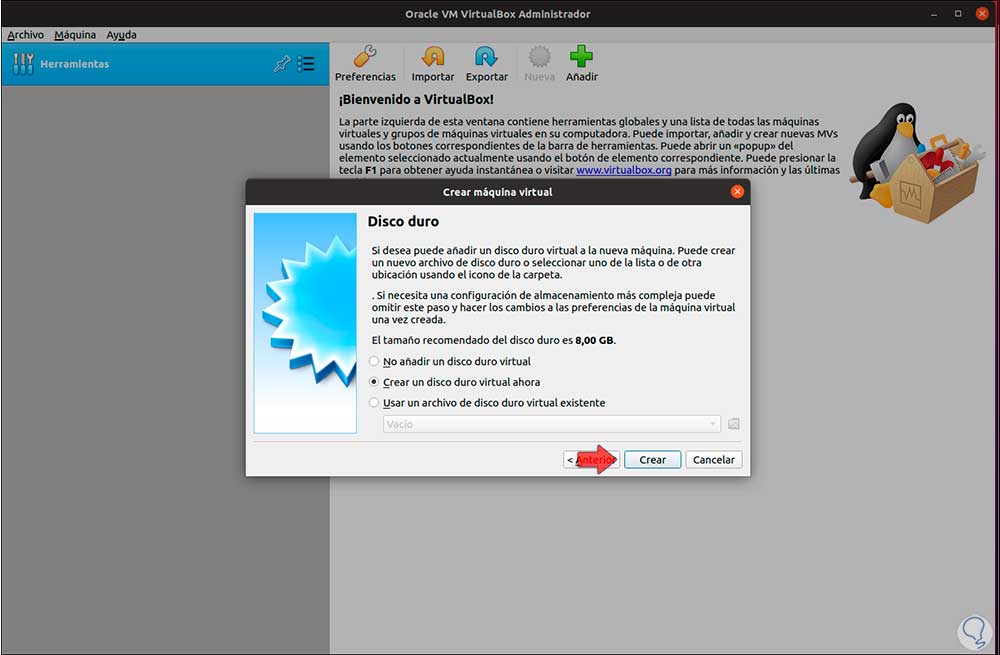 A continuación, seleccionamos la casilla “Crear un disco duro virtual ahora”: