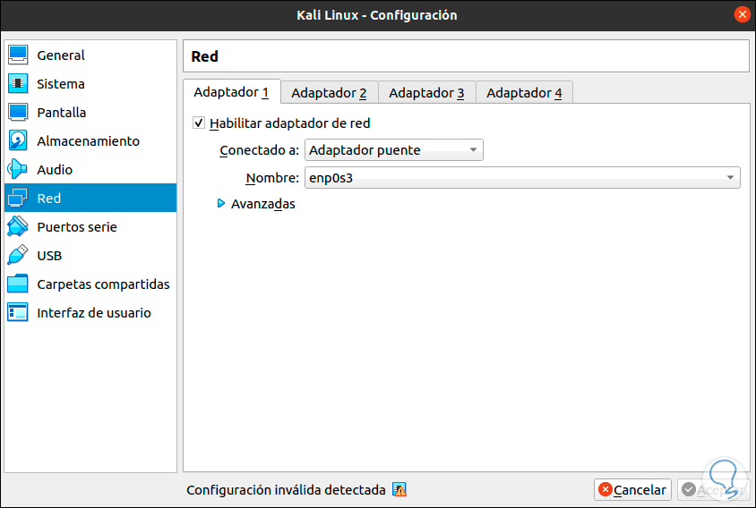 Es posible ir a “Configuración” para realizar ajustes de la máquina virtual como más memoria RAM, activar el adaptador de red, etc: