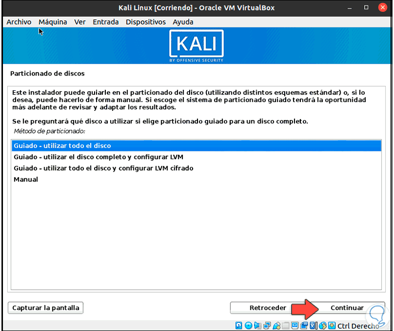 Podemos usar loa opción “Manual” para crear nuestros propias particiones, pero aconsejamos dejar la opción por defecto “Guiado – utilizar todo el disco”, damos clic en Continuar y seleccionamos el disco donde se instalar Kali: