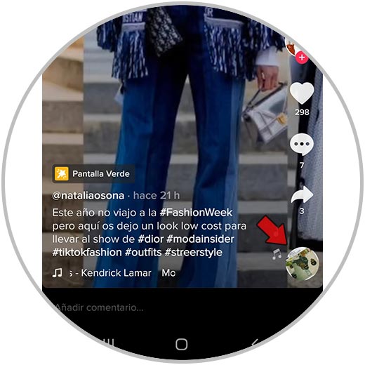 Lo primero que debes hacer es entra en tu cuenta de TikTok y acceder al vídeo desde el que quieres guardar el sonido. Ahora pulsa sobre la imagen del disco del que sale el sonido.