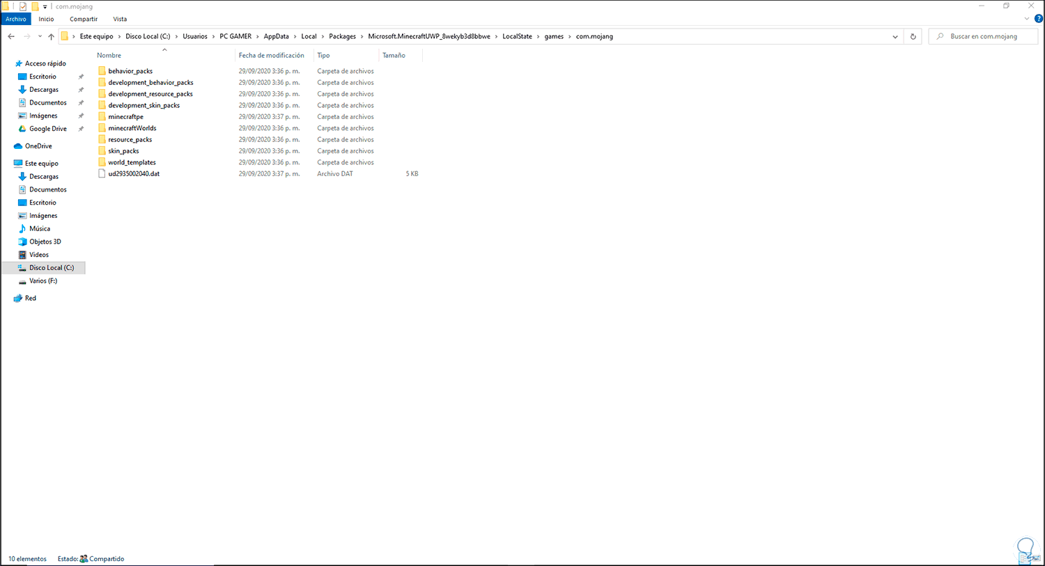 En esta ruta encontramos las carpetas por defecto de Minecraft para Windows 10, para esto iremos a la siguiente ruta: