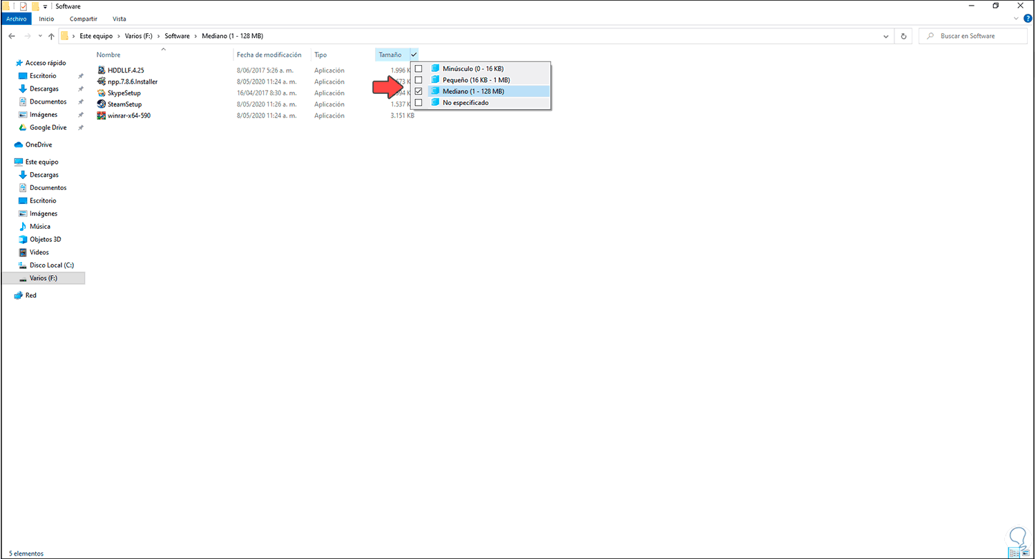 Para prevenir esto es ideal que como usuarios de Windows 10 determinemos el tamaño de cada archivo y en base a esto determinar si esos archivos de gran tamaño son necesarios dejarlos o no en el equipo, para no realizar esto de forma manual Solvetic te explicará cómo desplegar los archivos en base a su tamaño en Windows 10.