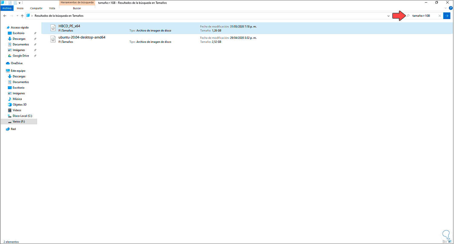 - tamaño:>1GB (Buscar archivos de tamaño mínimo de 1 GB)