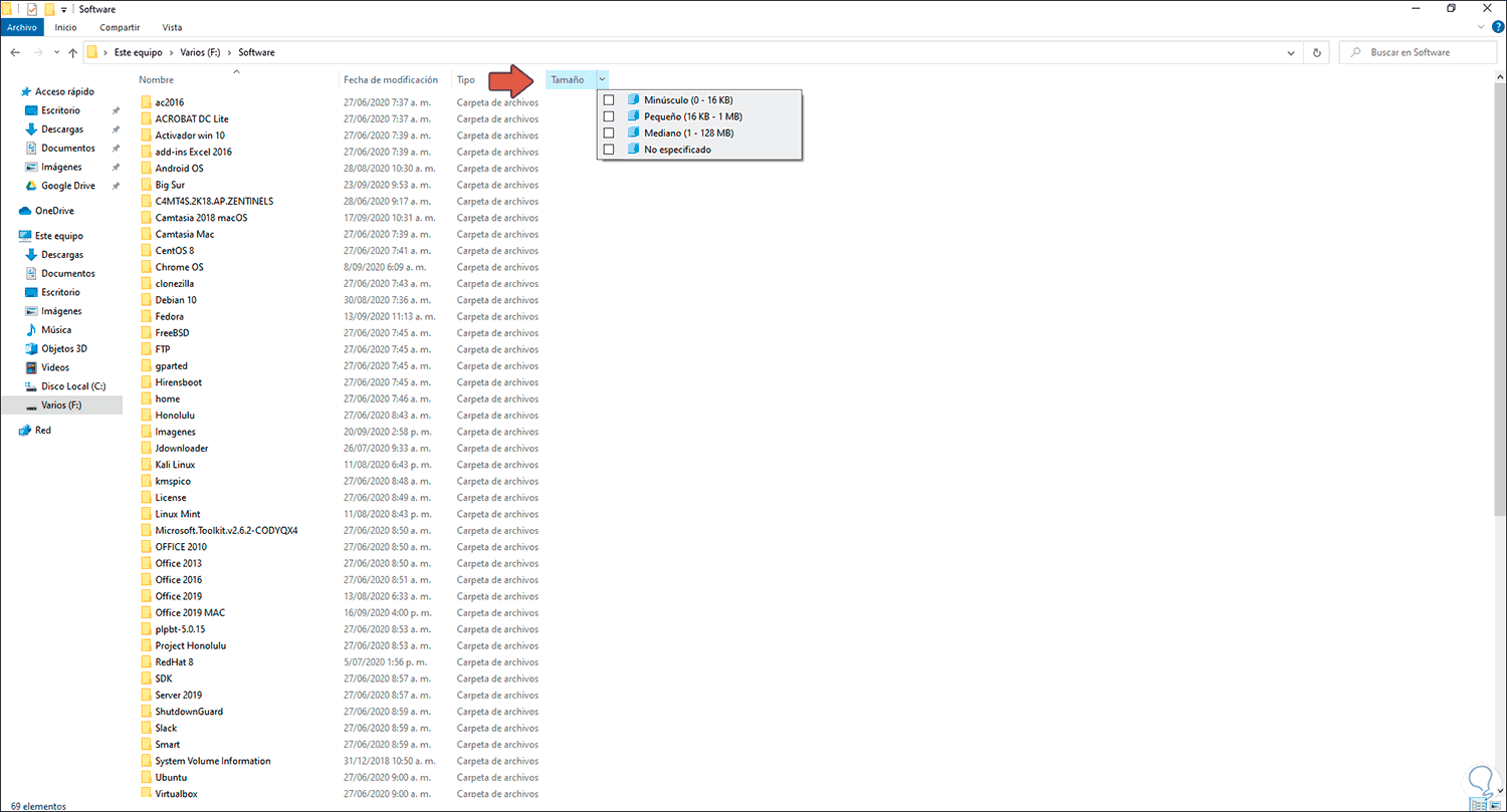 Para filtrar los resultados desde esta columna daremos clic sobre la flecha desplegable ubicada en la esquina derecha y se lanzara una ventana emergente que determina los diferentes tamaños disponibles en esa carpeta: