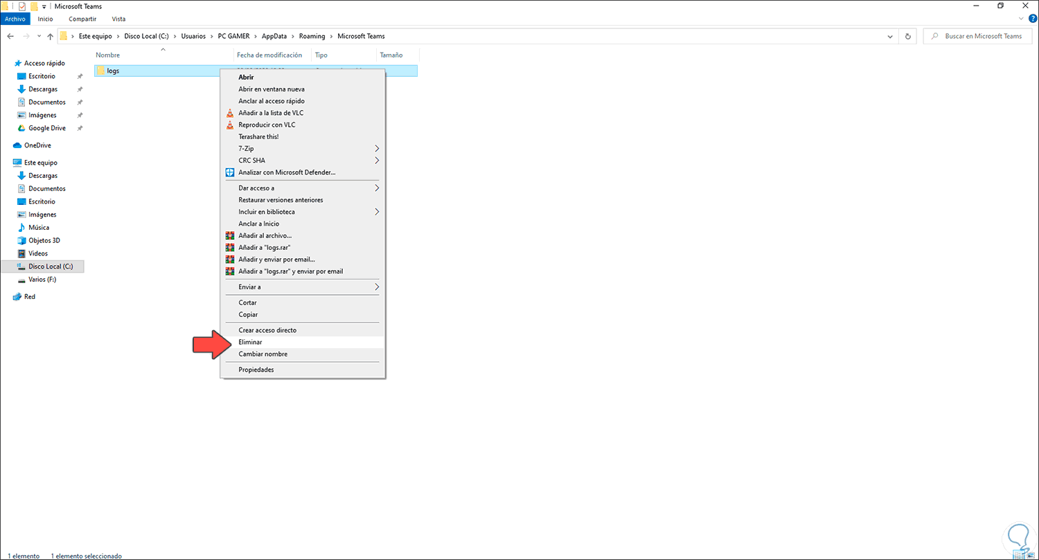 Allí está disponible una carpeta llamada “logs” donde se almacenan todos los eventos de Teams, damos clic derecho sobre ella y seleccionamos “Eliminar”: