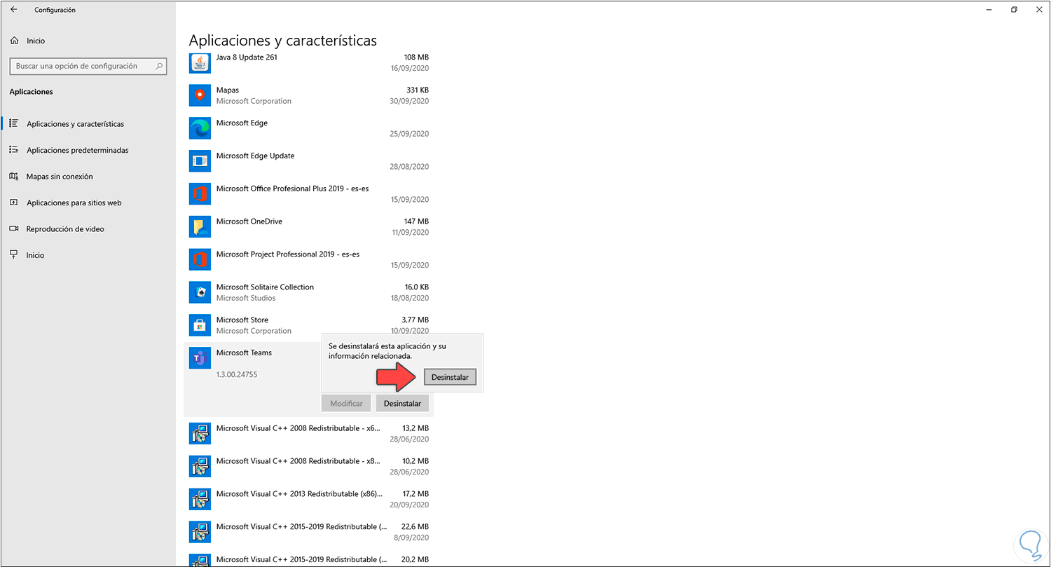 Ubicamos Microsoft Teams y al dar clic sobre ella se activará el botón “Desinstalar”, damos clic sobre este y de nuevo debemos confirmar el proceso: