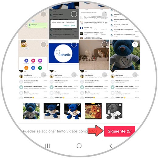 Lo siguiente que debes hacer es seleccionar las fotos y vídeos que quieres que aparezcan en el vídeo de TikTok. Una vez seleccionado esto, pulsa en "Siguiente"