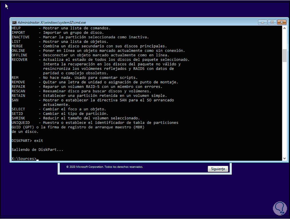 En esta ventana usaremos las teclas siguientes para acceder a la consola del símbolo del sistema:
