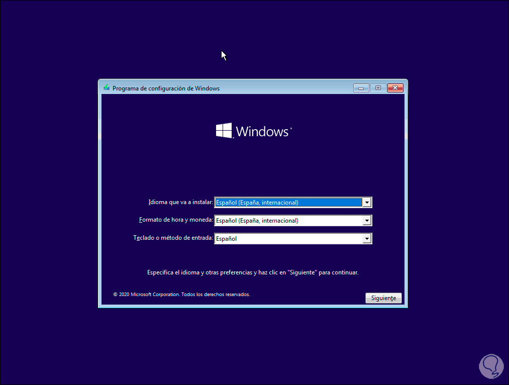 Para ello debemos contar con la imagen ISO de Windows 10 en un DVD o USB de arranque. La conectamos al equipo y al encenderlo pulsamos alguna tecla para iniciar el asistente de instalación de Windows 10: