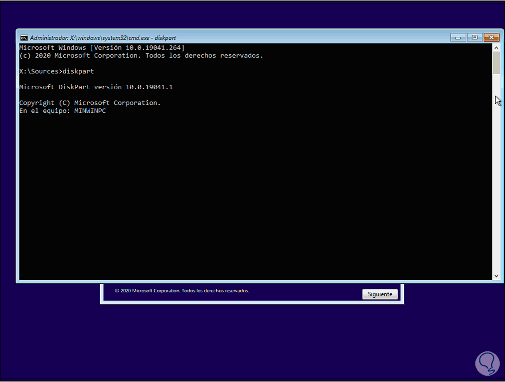 En la consola ejecutamos la utilidad Diskpart: