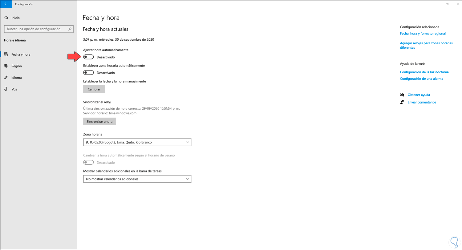Para cambiar la hora y fecha en Windows 10, en primer lugar, debemos desactivar el ajuste automático de estas, para ello vamos a la siguiente ruta: