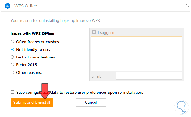 Al realizar esto se activará el asistente de desinstalación de WPS, es necesario seleccionar alguna razón para activar la opción de desinstalación de la aplicación: