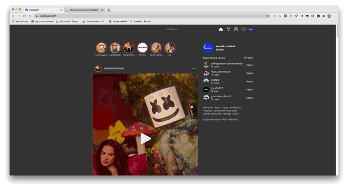 Ahora tienes que abrir con tu cuenta Instagram Web. Debes pulsar el icono de la extensión que acabas de descargar. Verás que de manera automática Instagram queda configurado en negro,