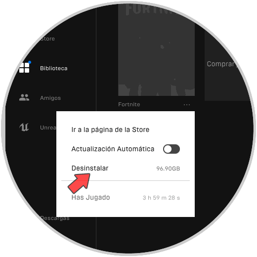 Para realizar este proceso accedemos al Epic Games Launcher, luego vamos a la sección “Biblioteca” , damos clic sobre el menú de Fortnite y en el listado desplegado seleccionamos “Desinstalar”: