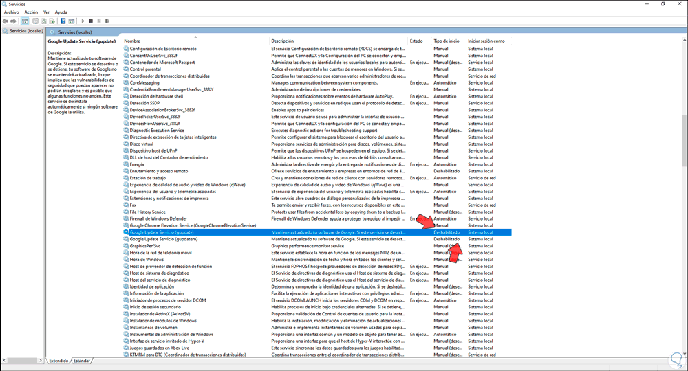 Damos doble clic o clic derecho / Modificar sobre Google Update Servicio (gupdatem) y en el campo “Tipo de inicio” establecemos “Deshabilitado”: